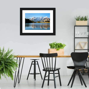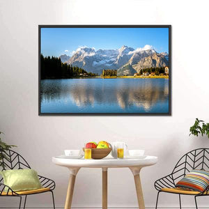 A realistic canvas print of a mountain lake scene that feels serene and majestic, with snow-capped Dolomite peaks, pine forest and resort buildings reflected in calm blue water. The rule-of-thirds composition and soft clouds around the peaks create a quiet, contemplative atmosphere suited to modern or nature-inspired rooms.