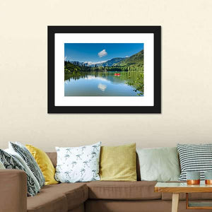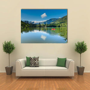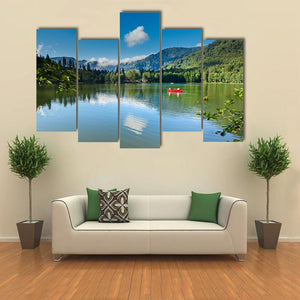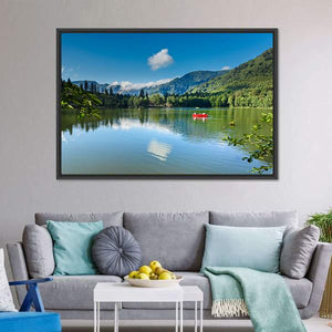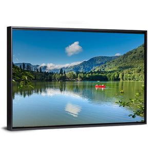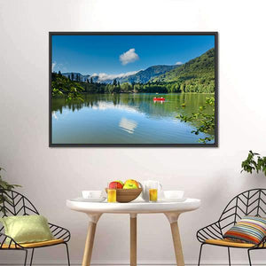Karagol Black Lake Canvas depicts a peaceful lake scene with mountains, trees and a small red boat, with clouds reflected on the water. Rendered in a realistic style with a blue, green and brown palette and a rule-of-thirds composition, it carries a calm daytime summer atmosphere. A natural fit for modern living rooms, studies, or house interiors seeking subtle nature-inspired wall decor.