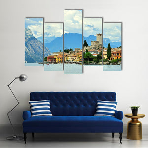 This canvas features a serene view of the picturesque lakefront town of Malcesine, framed by mountains and a historic castle. The realistic detail captures the beauty of nature with a blend of blue, green, and warm colors, making it a great addition to any space.