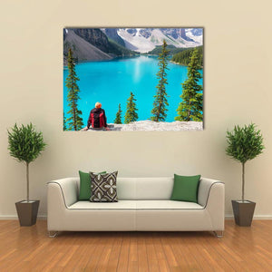 This canvas art captures the serene beauty of Moraine Lake, framed by majestic mountains and evergreen trees. A peaceful scene, it invites feelings of adventure and awe as a person sits on a rock, overlooking the tranquil blue waters.