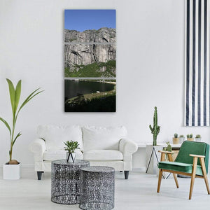 A photorealistic canvas print of a lake framed by a textured rock cliff, lush green shoreline, and calm water that reads as grand and serene. The muted grey, green, and blue palette suits modern or nature-themed rooms looking for a quiet, natural focal point.