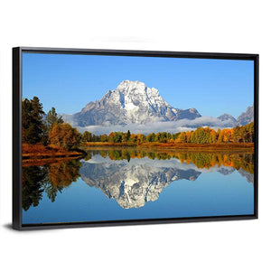 This canvas captures a serene landscape of a snow-capped mountain reflected in a calm lake, framed by colorful autumn trees. The peaceful palette of blue, orange, and green invites tranquility to any space.