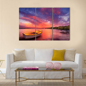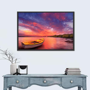 A yellow rowboat rests on a calm lake at sunset, with pink and purple clouds and a tree line reflected in the water. The scene reads as serene yet dramatic and vibrant, a modern nature print that fits living rooms or bedrooms.