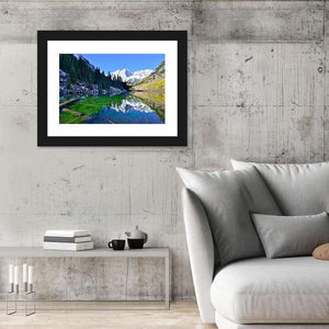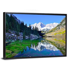 This canvas art captures serene snow-covered mountains reflecting in a tranquil lake, surrounded by autumn foliage. The photorealistic style and harmonious palette of blue, green, and white invite a sense of majesty into any space.