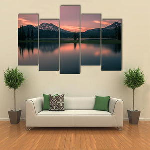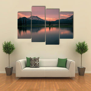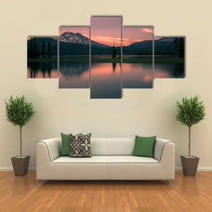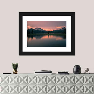 Sunset Over Sparks Lake shows snow-capped mountains, trees and a calm lake beneath a pink-and-purple dusk sky. The rule-of-thirds composition and a soft palette of purple, pink, blue, green and white create a serene, peaceful atmosphere. This nature-themed canvas fits modern or nature-inspired rooms as a quiet focal point.