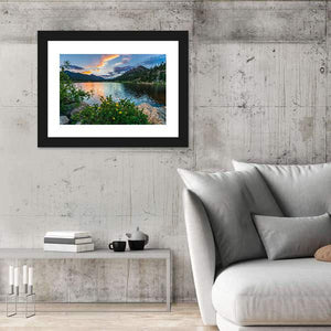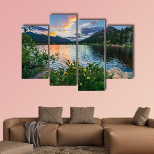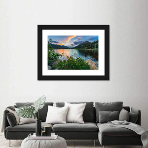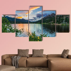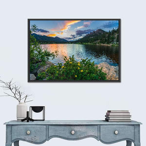 Sunset Sky Over Lily Lake depicts a realistic lakeside scene with mountains, shoreline foliage, and a glowing sunset sky. Rippling water and sunlight reflected across the surface give the image a serene, colorful, and majestic feel. Pairs well with modern room decor and nature-focused wall art.