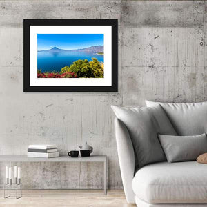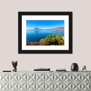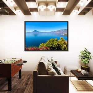 View From Lake Atitlan shows a cone-shaped volcano rising above calm blue water, with mountains, trees and bright red flowers in the foreground. Rendered in a nature-photography style, the composition uses depth and the rule of thirds to create a serene, vibrant lakeside scene. This piece suits home and room decor, especially modern interiors.