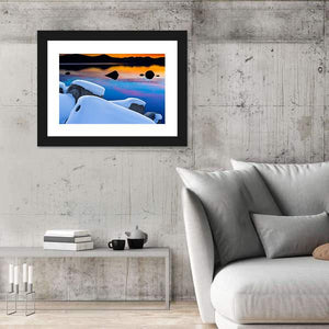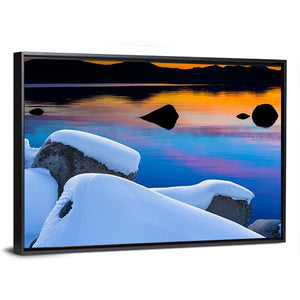 A tranquil winter scene of Lake Tahoe at sunrise, with snow-covered rocks and distant mountains framing a calm lake that reflects pink and orange sunset colors. The palette of blues, whites and warm tones gives a serene yet vibrant feel. Suited to modern room decor and contemporary wall art displays.