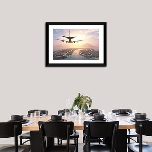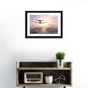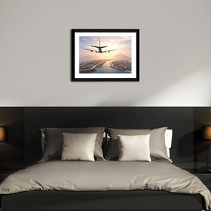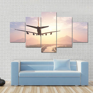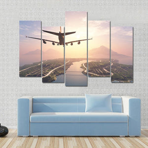 This stunning canvas art depicts a large passenger jet soaring over a picturesque landscape of winding roads and lush green hills. The serene palette of blues, greens, and warm oranges creates an awe-inspiring atmosphere, perfect for brightening up your space.