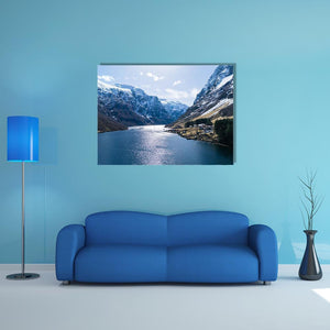Ardal Fjord Norway Canvas Art shows a serene fjord scene with snow-capped mountains, a calm lake, and a small cluster of buildings along the shore. Rendered photorealistically with wide-angle depth and a cool palette of blues, whites and greens, sunlight reflects on the water to create a majestic, peaceful mood that suits modern room decor.