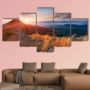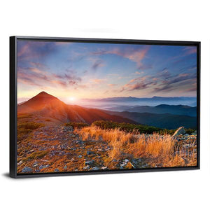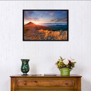 Autumn Sunrise Over Mountains shows a sun setting behind a mountain peak with rolling hills and tall dry grass in the foreground. The naturalistic scene pairs warm oranges and golds with cool blues to create a serene, majestic mood. Its rule-of-thirds composition adds depth, making it a calm focal piece for modern living rooms or bedrooms.