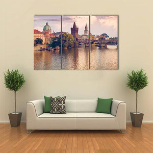 This canvas wall art beautifully captures Prague's serene charm with a picturesque scene of a river, a stone bridge, and quaint buildings. The warm palette of blue, gold, and pink evokes a cozy evening by the water, making it a lovely addition to your home decor.