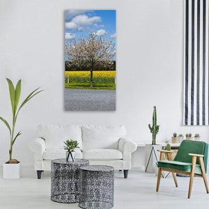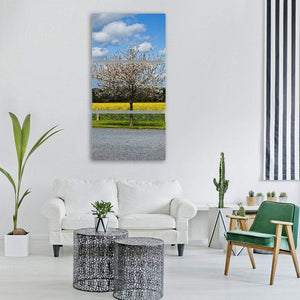 A photorealistic landscape showing a flowering cherry tree beside a road, set above a yellow rapeseed field and a blue sky dotted with puffy white clouds. The rule-of-thirds composition creates a serene, natural, bright atmosphere that suits modern and nature-inspired rooms.