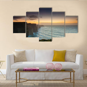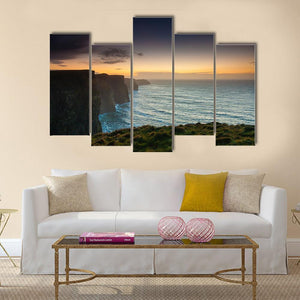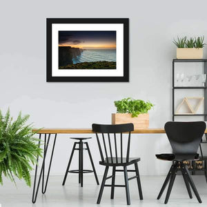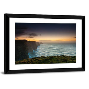 This canvas art captures the stunning cliffs of Moher at sunset, showcasing a serene and dramatic coastal landscape. The photorealistic details highlight choppy waves and stormy clouds bathed in golden hour light, perfect for adding a touch of nature to your space.