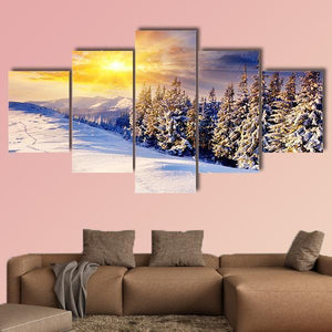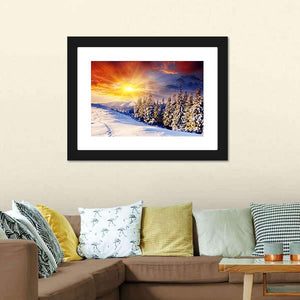 Dramatic Sunset In Winter depicts a winter scene of snowy mountains and pine trees lit by a warm orange and yellow sunset, with footprints in the snow drawing the eye. The composition uses depth and the rule of thirds to create a peaceful, awe-inspiring atmosphere. Its vibrant, dramatic palette of orange, yellow, blue, white, and green works well in modern or nature-inspired rooms.