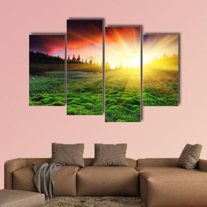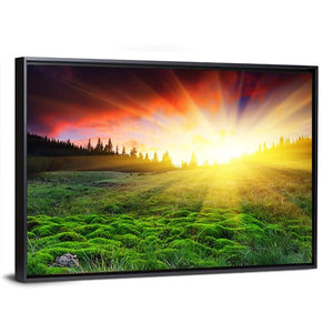 Mountain Sunrise Over Green Field Canvas Wall Art