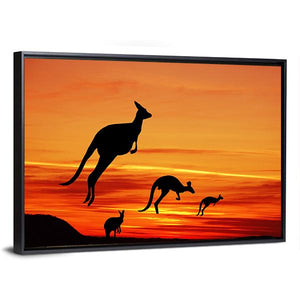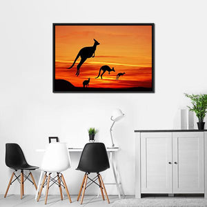 This canvas shows several kangaroos in mid-leap as black silhouettes against a striking orange and yellow sunset sky, highlighting dynamic motion. The minimalist silhouette composition creates a vibrant, serene, energetic mood that fits modern room decor and house interiors.