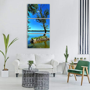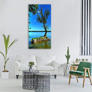 A canvas showing a lone tree rooted on a small grassy island in a clear summer lake, with exposed roots and open sky. The blue-green palette and rule-of-thirds composition create a serene, natural, slightly isolated mood. It works well in nature-inspired or modern wall decor.