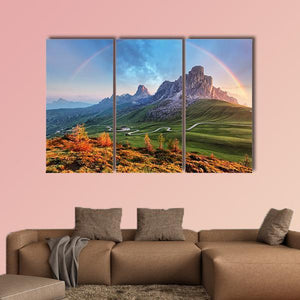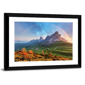 A bright rainbow arches across a dramatic mountain range with green slopes and a winding road, rendered in a realistic landscape style. The rule-of-thirds composition and strong sense of depth create a serene yet vibrant, hopeful scene that fits modern living rooms and nature-themed spaces.