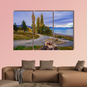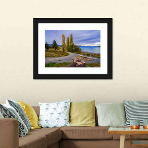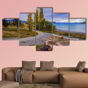 Scenery of New Zealand depicts a realistic lakeside landscape with tall deciduous trees, a winding gravel road and a tree stump in the foreground. The blue‑green, brown and grey palette and calm water create a serene, peaceful mood that fits modern or nature-inspired rooms.