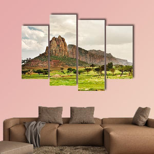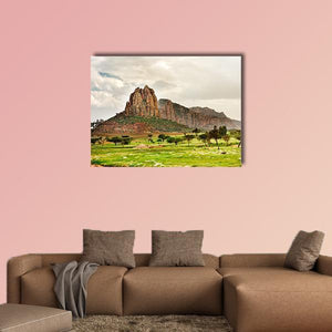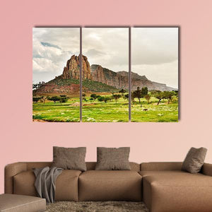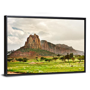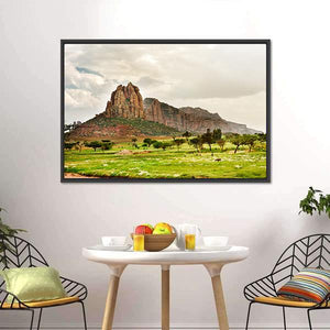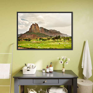 Landscape of Tigray shows a jagged rocky mountain rising above green fields and scattered acacia trees, rendered in a realistic, eye-level composition. The green, brown, grey, and white palette creates a serene, majestic feel that suits home and room decor with a nature focus.