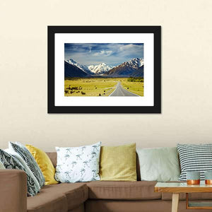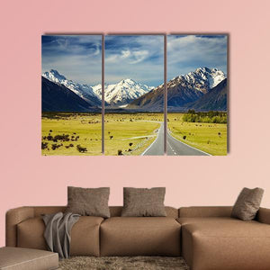 This canvas shows a winding road leading toward snow-capped mountains across grassy plains under a partly cloudy sky. The realistic landscape carries a peaceful, scenic, and vast atmosphere. It pairs well with modern home decor and nature-themed rooms like living areas or entryways.