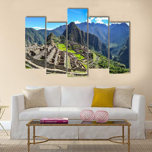 Machu Picchu City Canvas Wall Art captures an aerial, wide view of the Inca ruins and terraced fields set in the Andes. The photographic, realistic image uses greens, blues, greys, and browns to create a historic, serene, awe-inspiring mood. It fits well in modern or nature-inspired rooms.