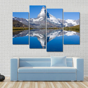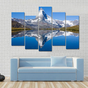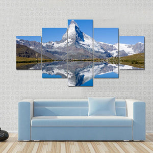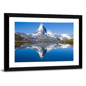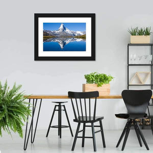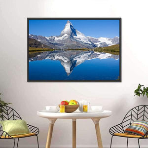 This artwork features the iconic snow-capped Matterhorn reflecting in a tranquil lake under a clear blue sky. Its serene and majestic vibe makes it a beautiful addition to any space.