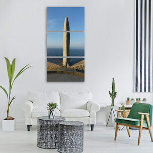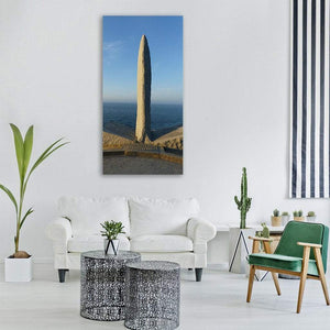 Monument Of War Tribute Normandy Canvas centers on a stone obelisk by a calm blue ocean beneath a clear sky, evoking a calm, monumental mood. The realistic, photographic landscape in blue, grey, and tan tones suits coastal or contemporary rooms as a thoughtful wall focal point.