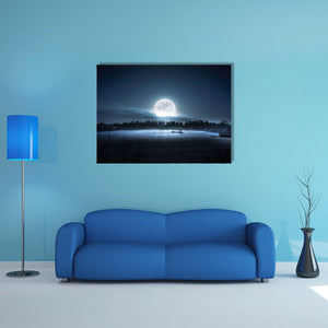 This landscape artwork features a full moon rising above a tranquil forest, creating an eerie yet mystical atmosphere. The dramatic palette of blue, black, and grey enhances the serene beauty of the scene, making it ideal for nature lovers.