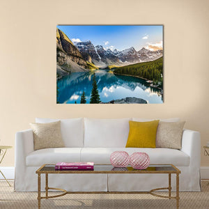 This canvas art captures the serene beauty of Moraine Lake and its majestic snow-capped mountains, enhanced by the tranquil reflection in the water. The soothing blues and greens evoke a peaceful atmosphere, making it a perfect addition to your nature-inspired decor.