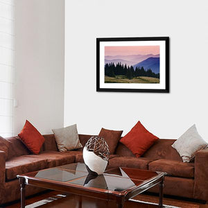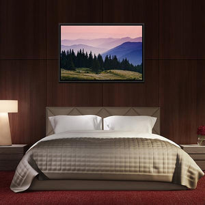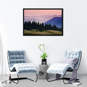 Beautiful Mountain Morning Canvas Wall Art shows layered, hazy mountains, a soft sky and dark green evergreen trees in a pink, blue, green and brown palette. The photographic, atmospheric composition emphasizes depth and a tranquil, morning-like mood, making it a calm nature piece for modern, nature-inspired rooms.