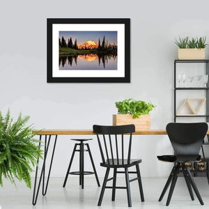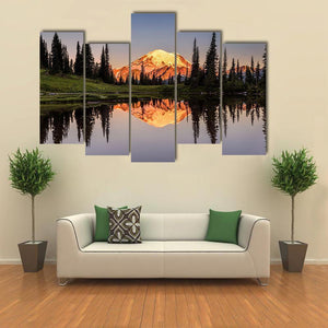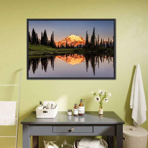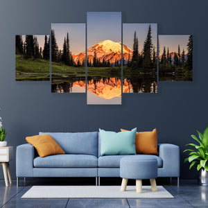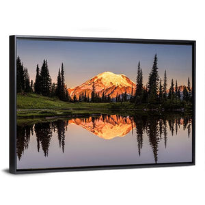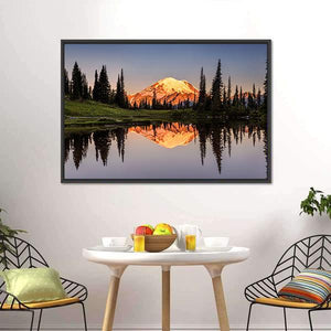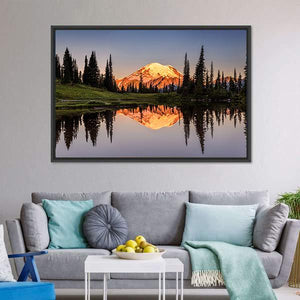 Mount Rainier reflected across a calm lake at sunset, with a snow-capped peak and surrounding trees mirrored in near-perfect symmetry. Warm golden-hour light and a blue‑green and orange palette give the scene a serene, majestic atmosphere that works well in modern or nature-inspired rooms.