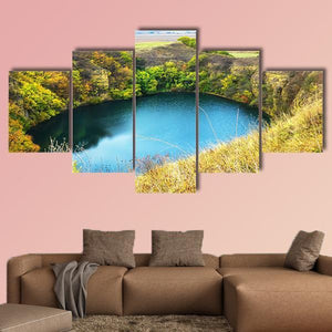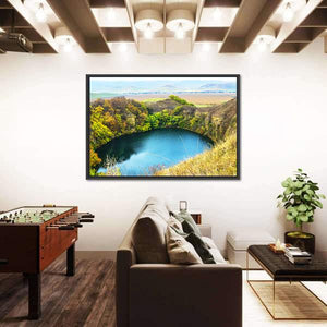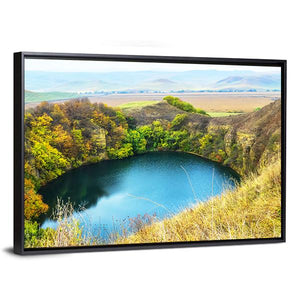 Shadkhurey Lake Russia Canvas Wall Art captures an aerial view of a crater lake framed by autumn trees and rolling hills. Realistic blues, greens, yellows and browns create a serene, vibrant mood with visible ripples on the water and grasses on the foreground slope; it suits modern or nature-inspired room decor.