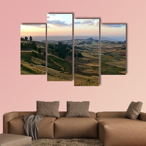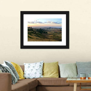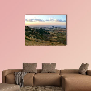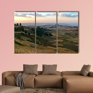 Mountain Landscape Ethiopia Canvas Art places rolling hills, patchwork fields, scattered trees and a warm sunset sky into a peaceful, expansive scene. The greens, browns, blues and yellows give a rustic yet modern feel that suits rustic or modern home decor.