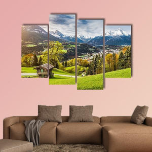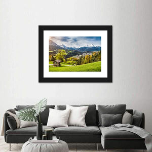 A realistic canvas showing a mountain village in the Bavarian Alps, featuring a traditional wooden cabin, sunlit alpine meadows, and snow-capped peaks. The scene reads as idyllic and peaceful, making it a natural fit for nature-inspired or modern interiors.