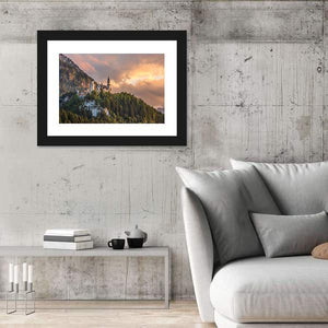 Neuschwanstein Castle, Germany sits among mountains and forest beneath a cloud-streaked sunset, giving the scene a majestic and dramatic presence. The print emphasizes green, brown and orange tones and a rule-of-thirds composition, making it a serene choice for modern home wall decor.