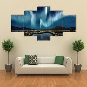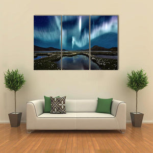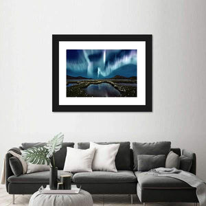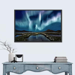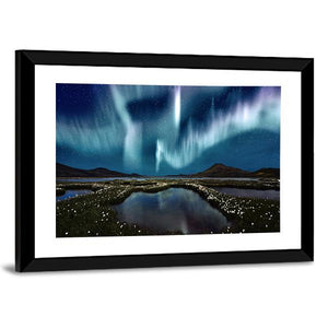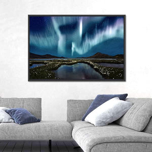 This canvas wall art captures the magic of the aurora borealis above a serene landscape of wildflowers. The tranquil blue and green hues reflect beautifully in the water, bringing the awe-inspiring northern lights to your space.