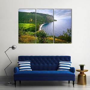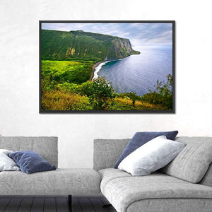 This canvas features a breathtaking view of coastal cliffs meeting the vast ocean, surrounded by lush green hills. Its serene and majestic mood is perfect for enhancing any space.