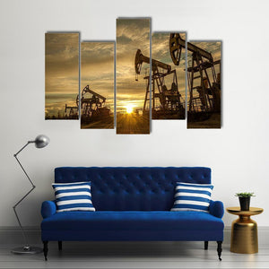 Oil pump jacks stand against a sunset sky in a low-angle, wide view, with sun rays radiating from behind the pumps. Warm oranges, yellows and browns blend with grey tones for an industrial, atmospheric, dramatic look that suits modern or industrial room decor.