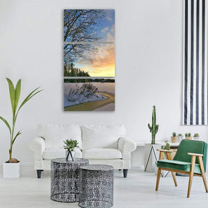 Pathway In Winter Landscape Canvas shows a serene winter scene: a snow-covered path winding past bare trees, an icy stream bed and a conifer forest beneath a sunset sky. The realistic, photographic image uses blue, white and warm orange tones and fits modern living rooms or nature-themed spaces.