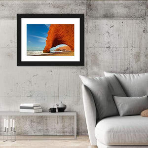 This canvas features a majestic natural rock arch along a serene beach, beautifully capturing the vibrant hues of the ocean waves and blue sky. The sunlight illuminates the arch and fluffy clouds enhance the peaceful atmosphere.