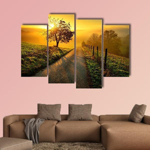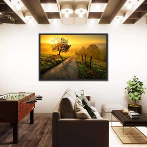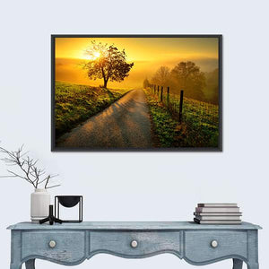 A realistic rural landscape featuring a road up a hill, a tree catching morning sunlight, and fields stretching into the distance. Sunbeams through the branches and a fence along the road create depth and a peaceful, hopeful mood; the golden-yellow, green and brown palette suits modern or nature-inspired rooms.
