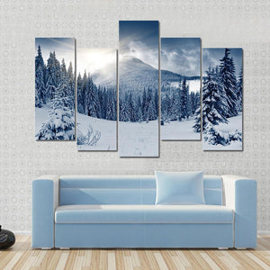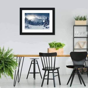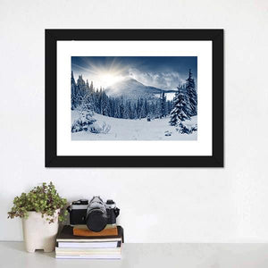 This canvas wall art captures the beauty of a serene winter landscape featuring majestic snowy mountains and snow-covered pine trees. With sun rays piercing through the clouds, this piece brings a bright, cold atmosphere to any space.