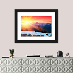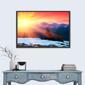 Spring Landscape With The Cloudy Sky shows snow-dusted mountains beneath a warm sunset sky in a realistic style. Sun rays breaking through clouds and stands of pine trees create a serene, majestic mood, suitable for nature-inspired room decor.