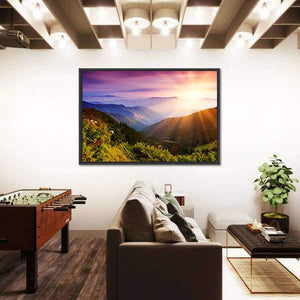 A realistic summer landscape of a mountain range and valley framed by forest at sunrise, with sun rays piercing morning mist. The purple, orange, green and blue palette gives the scene a peaceful, serene, and majestic atmosphere. It fits well in modern or nature-inspired rooms as calming wall art.