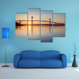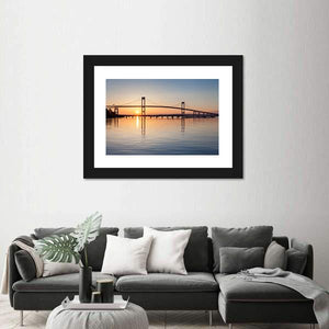 This canvas artwork features a serene view of the Newport Bridge at sunrise, with the silhouettes of the bridge towers against a warm palette of blue, orange, and yellow. It’s perfect for adding a peaceful touch to your space.