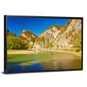 This canvas captures a wide-angle, realistic view of a river winding between rocky cliffs, mountains and trees with a small boat on calm, reflective water. Blues, greens, browns and autumn foliage give the scene a serene, peaceful yet vibrant feel. It fits well in modern living rooms or entryways as nature-focused room decor.
