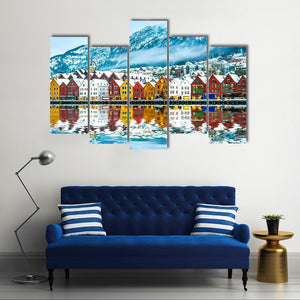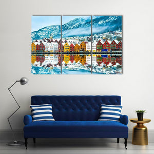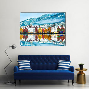 This canvas artwork showcases a picturesque harbor scene in Bergen, Norway, featuring vibrant buildings, serene waters, and stunning snow-capped mountains. Its colorful composition adds a lively touch to any space.