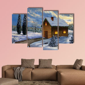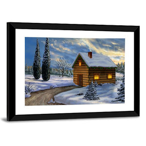A log cabin sits in a snowy Christmas landscape among pine trees, with lit windows and a wisp of chimney smoke lending a cozy, peaceful winter mood. Cool blues and whites balance warm browns and orange highlights to create a rustic, vintage scene that works well in cabin, farmhouse, or nature-inspired room decor.
